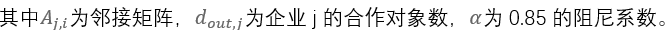 本文借鉴社会网络分析方法,对企业层面的供应链网络进行描述与量化。近年来,PageRank中心性被引入经济学研究领域。该指标用于衡量企业供应链网络的相对优势在于:其算法在综合反映供应链网络关联性方面优于传统网络测量指标,同时能有效弱化其他节点中心性的影响。其核心公式如下: