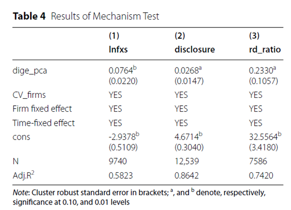 技术创新效应的检验结果见表4(3)。我们发现数字经济变量的估计系数显著为正,表明数字经济确实对促进企业创新发挥了重要作用。基于数字经济的概念,其发展主要依赖于新兴技术的开发与应用。其深层原因可概括为三方面:首先,在数字经济时代,企业可通过应用数字技术及时获取产品与客户信息。其次,数字经济的发展为企业获取最新信息资源和技术资源提供了便利。第三,数字经济的发展往往促进新企业的进入,企业间的竞争日益激烈,这将迫使企业增加创新投入并提升技术创新水平——因为在此环境下,若企业不提升创新能力,便无法在数字经济时代的激烈竞争中长期生存。