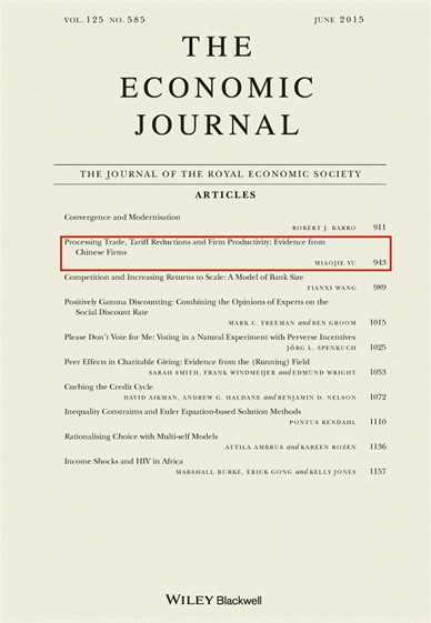 本期介绍发表在《经济学期刊》(The Economic Journal)第125期第585卷的文章,其题目为Processing Trade, Tariff Reductions and Firm Productivity: Evidence From Chinese Firms,由余淼杰独立发表。截至当前,该文在Google学术上的引用量已达1089次。