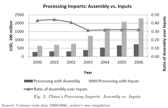 由于80年代多数中国企业缺乏进口所需资金,加工组装贸易更为普遍。自90年代以来,加工投入贸易逐渐占据主流。这一趋势在图2中清晰可见:在加工进口领域,加工组装贸易的比例从2000年的0.41下降至2006年的0.32。