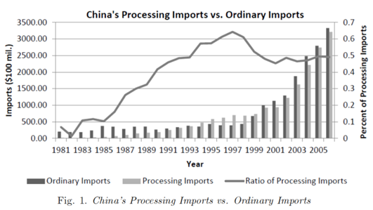 图1显示,与普通进口相比,中国加工进口在20世纪80年代初仅占进口总额的一小部分。然而,随着1990年代初期加工进口的显著增长,到1992年中国正式宣布实行市场经济体制时,加工进口已开始主导普通进口领域。此后,加工进口占比超过全国进口总额的50%。