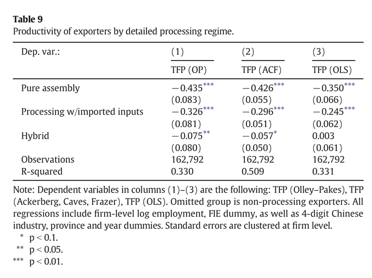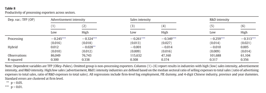 研究由表8,表9表明,在分销、广告和研发密集的行业中,加工贸易企业的生产率劣势更加明显。同时,纯组装企业的生产率比进口材料加工企业更低,进一步支持了固定成本假说。