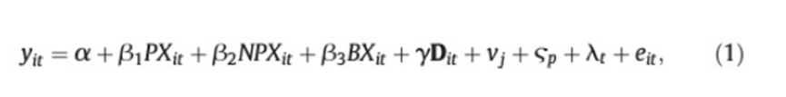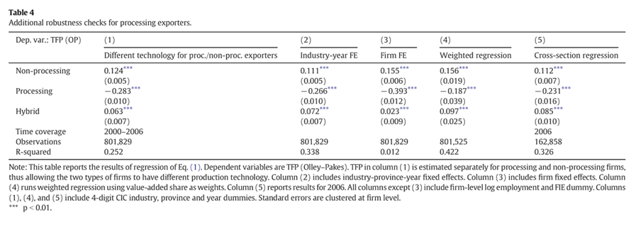 其中yit是公司I在t年的生产率PXitis如果公司是加工出口商,则等于1的假人(即,在任何给定的年份,这些公司只报告加工交易);NPXitis是非加工出口商的假人(即,在任何给定年份,这些公司只报告非加工交易);BXit是同时进行加工贸易和非加工贸易的出口商的假人(即,在任何一年,公司都报告加工和非加工交易);省略的组是非出口商。D是企业层面的控制变量。此外,研究还控制了一整套4位数的行业假人(vj)、省份假人(ςp))和年份假人(λt).