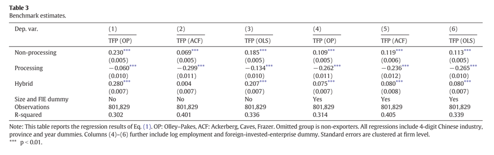 研究的基线回归方程(1)使我们能够了解不同类型的出口商相对于非出口商的生产率。表3报告了研究对三个TFP测量的基线估计结果:TFP (OP), TFP (ACF)和TFP (OLS)。在(1)-(3)列中,研究将TFP与企业的加工状态进行了回归,并控制了行业、省份和年份的固定效应。研究发现加工假人的系数为负且显著,这表明加工出口商的生产率低于非出口商;相反,非加工出口商的生产率始终高于非出口商,这与其他国家企业层面数据广泛记录的证据一致。这些结果一致适用于使用不同方法计算的所有TFP指标。在第(4)-(6)列中,研究进一步控制了公司规模(以对数就业为代表)和外资所有权虚拟值。