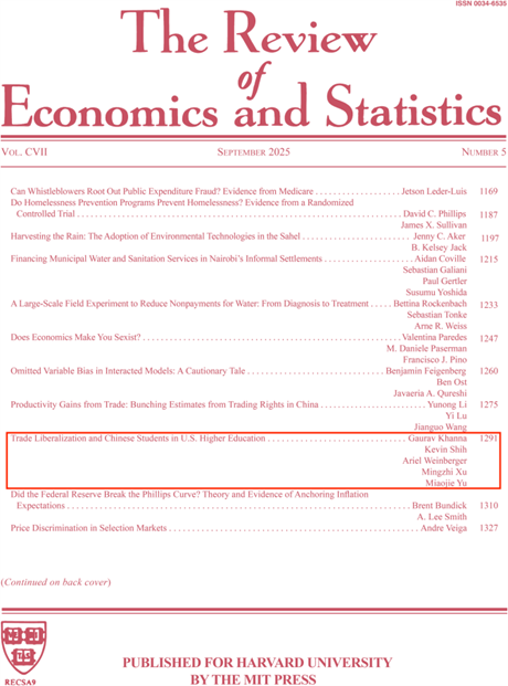 本期介绍发表在《经济与评论统计》(The Review of Economics and Statistics)第575期107卷的文章,题目为Trade Liberalization and Chinese Students in U.S. Higher Education,由Gaurav Khanna(加州大学圣地亚哥分校),Kevin Shih(纽约皇后学院),Ariel Weinberger(乔治华盛顿大学),徐铭梽(北京大学),余淼杰(辽宁大学)合作发表。