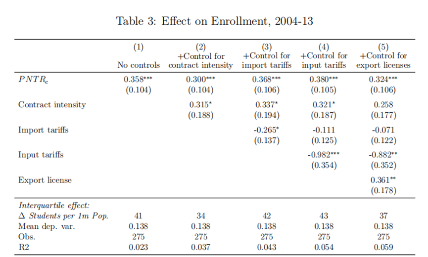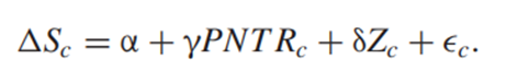本文通过以下基准模型,分析城市永久正常贸易关系(PNTR)暴露度与赴美留学生数量的关系。结果变量采用长差分(long-differenced)形式,从而消除了城市特定且不随时间变化的因素的影响。具体设定如下: