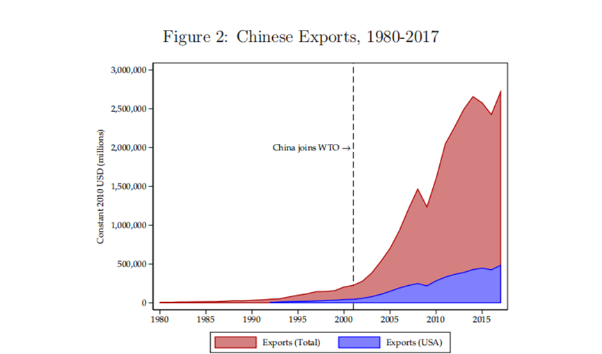 图2展示了中国对全球的出口情况以及对中国对美国市场的出口情况。2001年中国加入了世贸组织,美国将对中国的 NTR 关税永久化,关税骤升风险的消除,促进了中美贸易往来及中国城市的出口驱动型增长。获得 PNTR 后一年内,中国对美出口增长57%,五年内增长177%