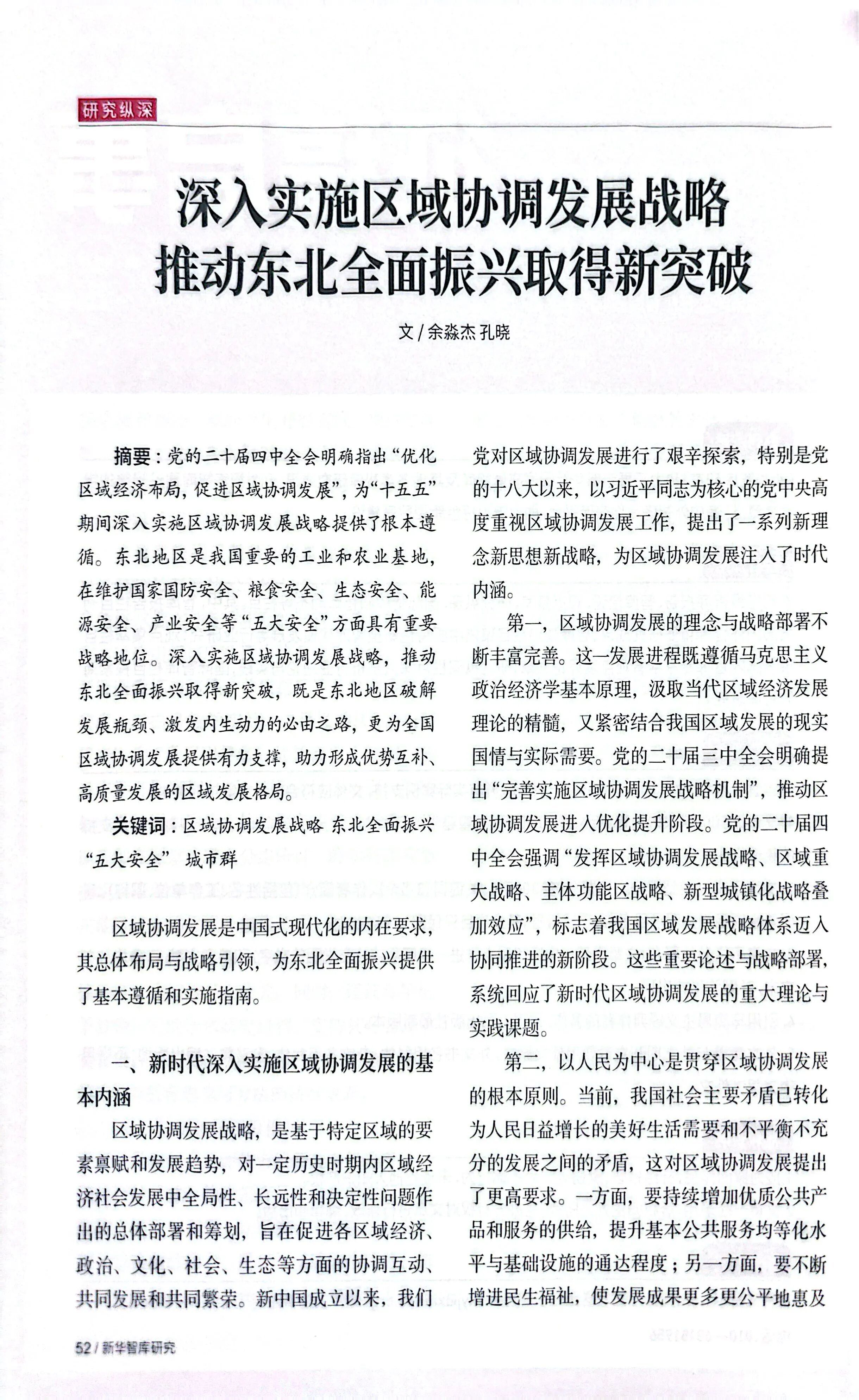 关键词:区域协调发展 东北振兴 “五大安全”