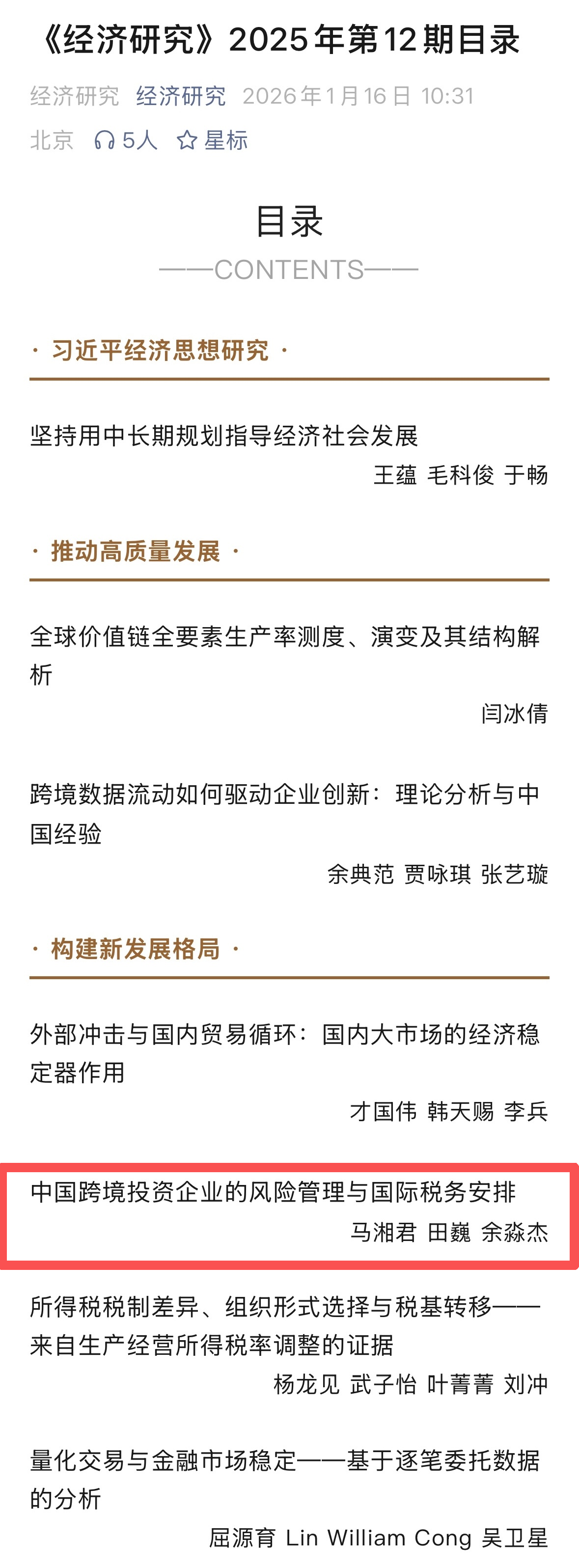 近日,辽宁大学校长余淼杰教授、辽宁大学中国经济研究院副院长马湘君教授、北京大学经济学部长聘副教授田巍的合作论文《中国跨境投资企业的风险管理与国际税务安排》在《经济研究》2025年第12期发表。