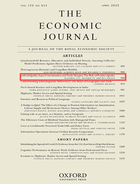 制度不仅决定了贸易的比较优势,更深刻影响着全球价值链中的产品质量与价格竞争。本期介绍发表于经济学顶级期刊The Economic Journal 2022年4月第132卷第643期的一篇重磅研究。论文题目为Judicial Quality, Input Customisation and Trade Margins: The Role of Product Quality (中文译名:《司法质量、定制化投入品和贸易边际:产品质量的作用》)该文由崔晓敏(中国社会科学院)、余淼杰(辽宁大学)以及张睿(丹麦奥胡斯大学) 三位学者合作发表。