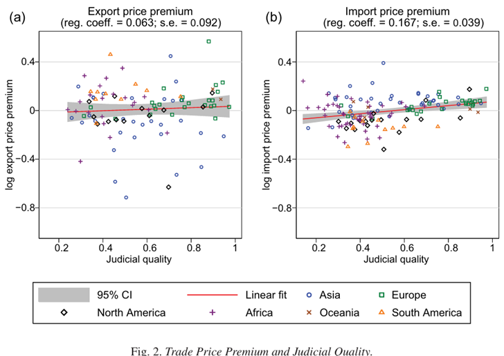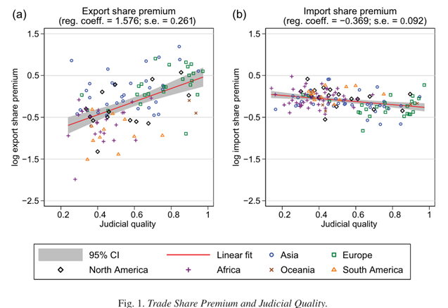 下图(Figure 1)直观展示了司法质量对贸易份额的影响: