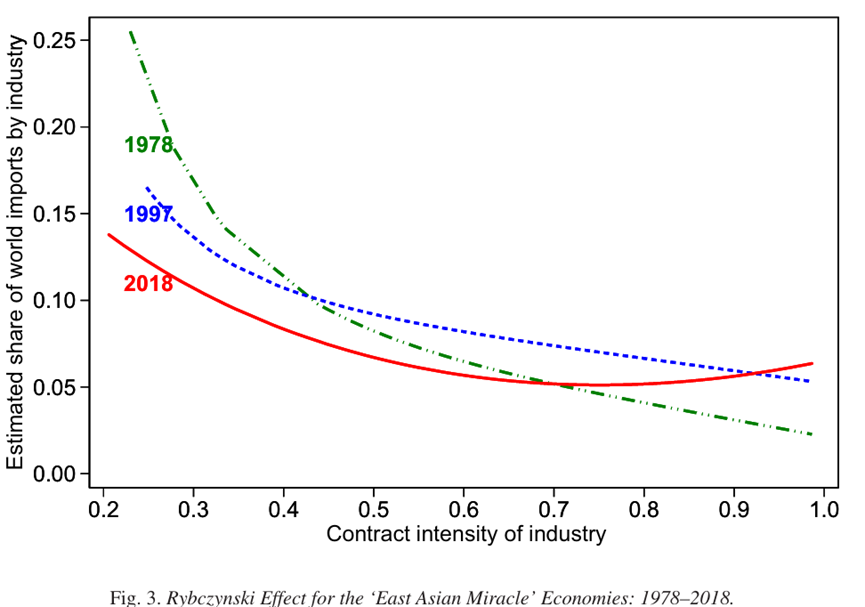 • 随着时间的推移,亚洲四小龙在高契约密集度行业(横轴右侧)的世界市场份额(纵轴)显著上升。