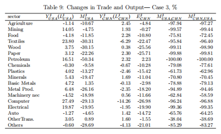 第三种情形是对中美贸易战作用于产出、贸易和福利的影响进行分析。在“针对中国”情形基础上,中国对美国同样加征45%的进口关税。情形三与情形一存在四点相同:第一,美国总产出、总进口、从中国进口额与情形一相似;第二,美国多数领域削减进口,其中石油、纺织品、木材和计算机等行业进口降幅最为明显;第三,中国总产出和总出口变化幅度与情形一相似;第四,效果仍能从贸易战中获益。