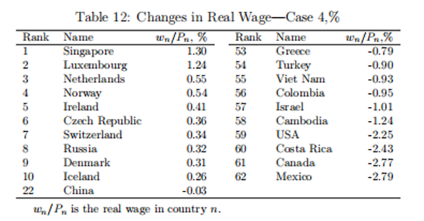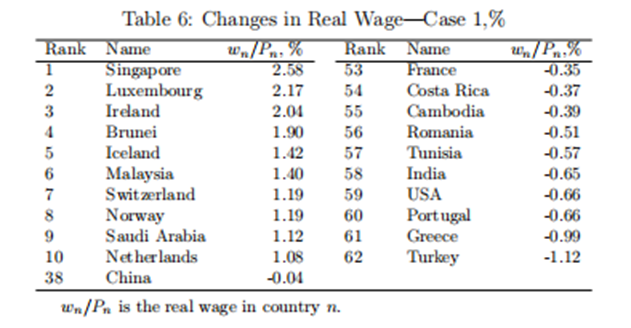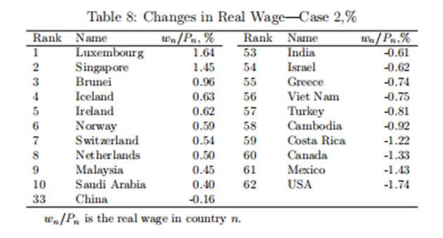 然而,由于关税提高导致进口价格上升,美国实际工资水平下降,其造成的福利损失约为0.66%,中国同样面临福利损失,但其实际工资仅下降0.04%,幅度远小于美国。部分国家(如新加坡和卢森堡)因贸易转移二受益于关税上调。另一方面,美国自身增长而扩大出口,非美国市场上的商品供给激增导致均衡价格下降,从而使进口量较大的国家从低价中获益。