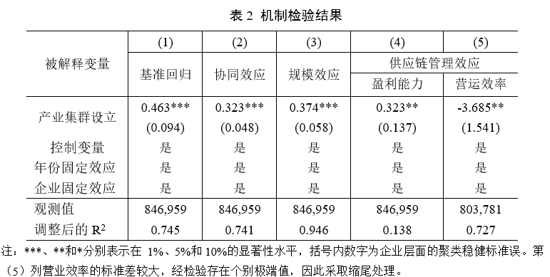 文章提出三条可能的影响机制:一是“协同效应”。该效应体现为集群企业间的合作、学习与竞争,可优化技术与管理水平,同时降低信息不对称、促进供需匹配,从而提升劳动生产率。分析结果表明:产业集群设立能够推动企业共同实施联合生产项目,发挥“协同效应”。二是“规模效应”。该效应通过产业集聚实现资源共享与技术溢出,增强生产效率。分析结果表明:政策能够扩大企业规模,形成“规模效应”。三是“管理效应”。该效应包括盈利能力和营运效率提升,前者有助于掌握市场需求、稳定产销关系,后者则有助于优化运营流程。分析结果表明:产业集群政策主要通过增加盈利能力来实现“管理效应”,企业加入产业集群有利于增强客户黏性,保障产品顺利销售,扩大收入份额;然而,产业集群政策不利于企业营运效率提升,这会一定程度上削弱“管理效应”。