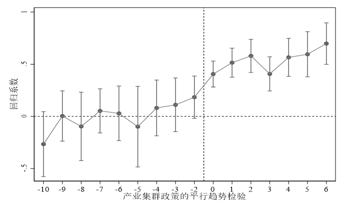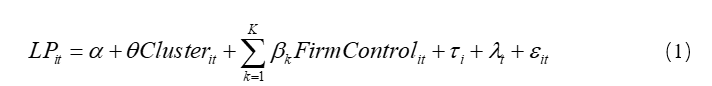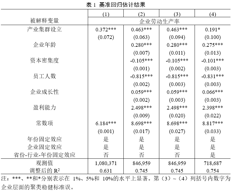 其中,下标i、t分别代表企业、年份。LP it表示企业劳动生产率,Cluster it表示产业集群设立,FirmControl it表示企业层面随时间变化的控制变量。γi、λt分别表示企业、年份层面的固定效应,分别控制企业不随时间变化的不可观测因素、所有企业在某一年内面临的相同宏观冲击。εit表示残差项。