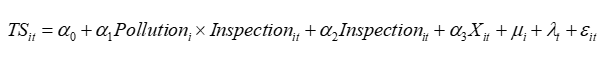 其中,TSit为i企业t季度纳税遵从度的反向指标,Pollutioni为i企业所在省份2015年(中央环保督察开展前一年)污染程度虚拟变量,Inspectionit为中央环保督察虚拟变量,Xit为一系列控制变量,μi和λt分别为企业固定效应和时间固定效应,εit为随机扰动项。