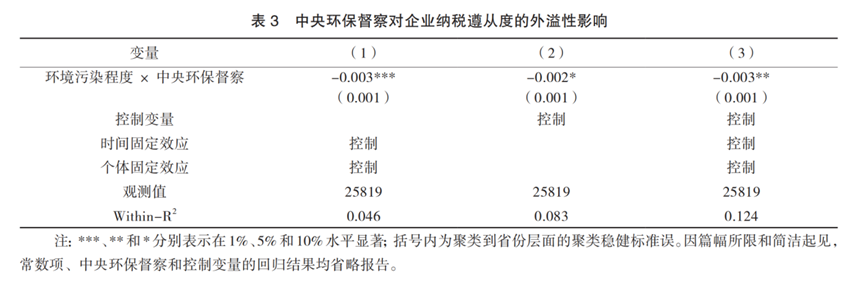 本文采用三重差分模型,以企业纳税遵从度为被解释变量,核心解释变量包括中央环保督察和环境污染程度虚拟变量。中央环保督察对企业纳税遵从的外溢性影响的基准回归结果见表3,其中,第(1)—(3)列分别为逐步纳入控制变量、企业与年份固定效应的估计结果,可知环境污染程度和中央环保督察虚拟变量的交乘项系数显著为负,表明中央环保督察显著提高了污染较重地区的企业纳税遵从度。