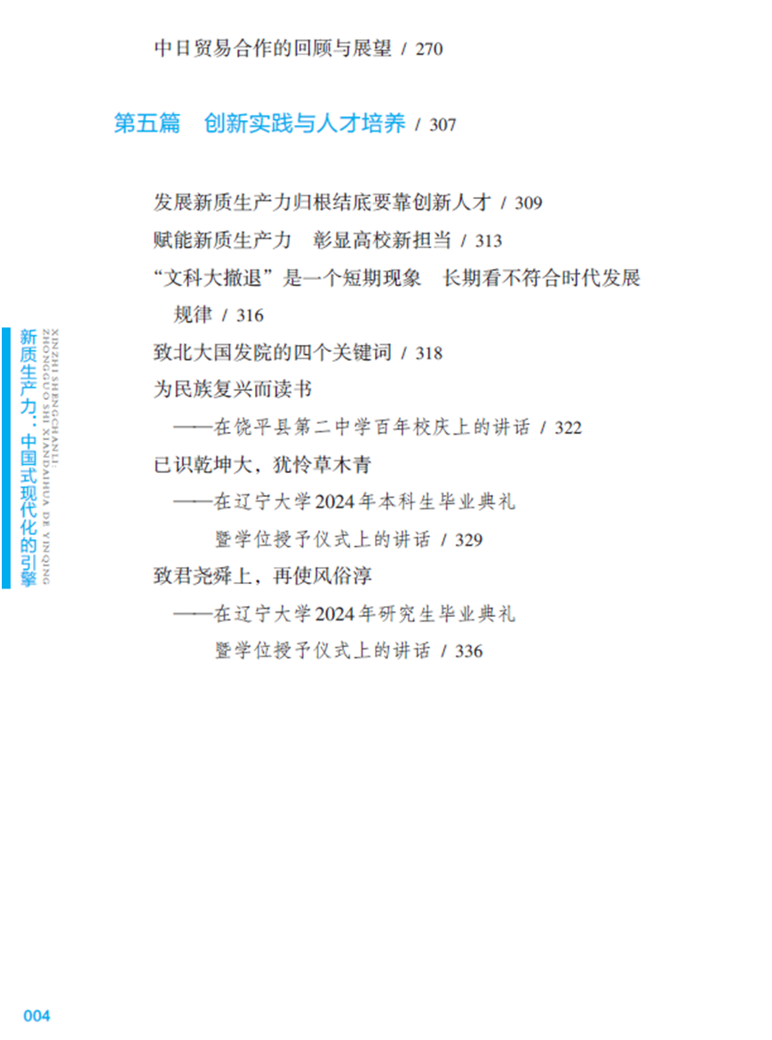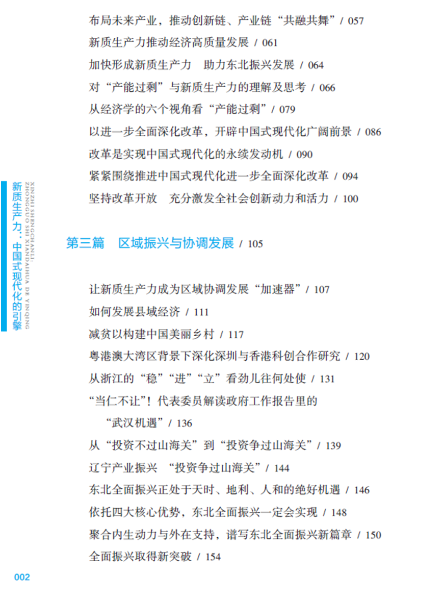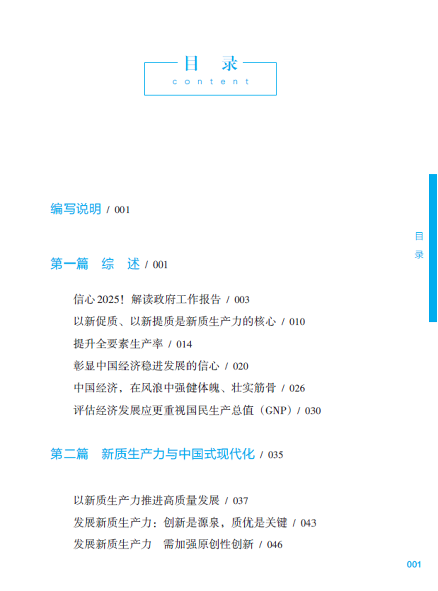 全书分为五篇。首篇从宏观经济视角解读政策方向,分析新质生产力作为改革动力系统的关键地位;第二篇聚焦新质生产力的本质特征,探讨如何通过技术突破、要素配置和产业升级实现高质量发展;第三篇结合区域发展战略,展现新质生产力在促进区域协调发展中的实践价值;第四篇从国际视野出发,探讨高水平开放格局下的发展机遇与挑战;第五篇聚焦人才根本,强调人才培养对发展新质生产力和中国式现代化的基础性作用。