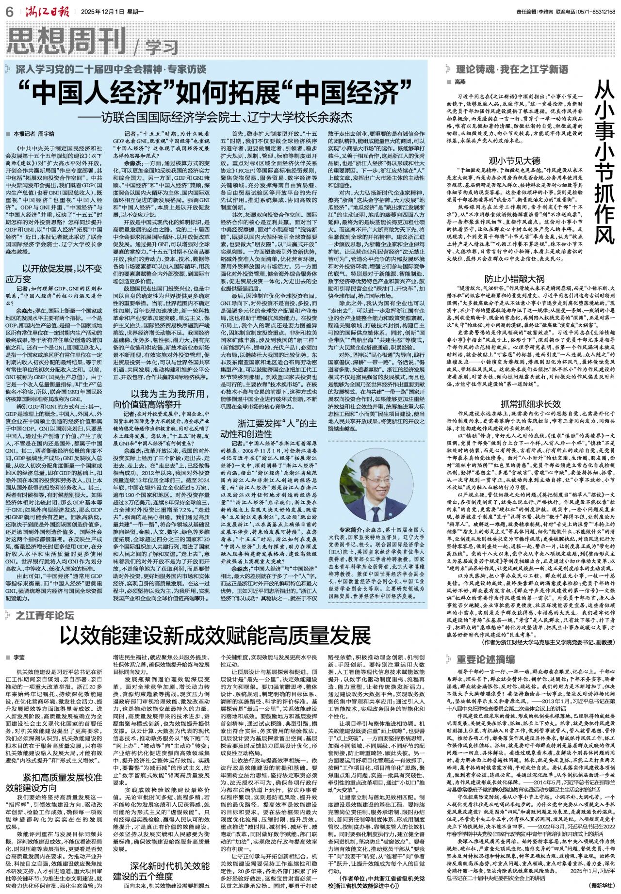 记者:“中国人经济”在浙江有着深厚的根基。2006年11月1日,时任浙江省委书记习近平在《“浙江人经济”拓展浙江经济》一文中,深刻阐释了“浙江人经济”的内涵,指出“‘浙江经济’是浙江省域范围内浙江人和非浙江人创造的经济总量,而‘浙江人经济’则是浙江人在浙江以及浙江以外任何地方创造的经济总量”“‘浙江人经济’启示我们,浙江要在新的起点上实现又快又好的发展,既需要‘立足浙江发展浙江’,又必须‘跳出浙江发展浙江’,以在高基点上确保目前的发展不停步,将来的发展可持续”。在您看来,“十五五”时期,浙江如何在发展“中国人经济”上先行探索,助力在深度融入服务构建新发展格局、建设高能级开放强省上实现重大突破?