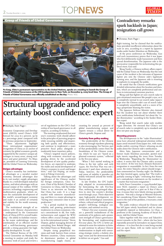 Earlier on December 2, the Organization for Economic Cooperation and Development (OECD) raised China's GDP forecast for 2025 to 5 percent, up by 0.1 percentage point compared with its previous projection in September.