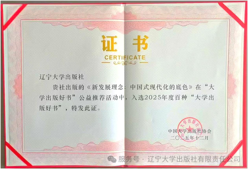 2025年12月13日,中国大学出版社协会年会在杭州召开,大会开展首届“大学出版好书”公益推荐活动,评选出2025年度百种“大学出版好书”。我社出版的余淼杰教授著作《新发展理念:中国式现代化的底色》获此殊荣。该书曾入选2025年第二季度“辽宁好书”和中国新闻出版广电报2025年8月优秀畅销书排行榜。