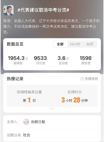 这一建议由《光明日报》发起微博话题“代表建议取消中考分流”,迅速引爆舆论场,登顶热搜榜首,话题在微博社会榜最高排名第1位,在榜时长近4小时;传播量级惊人,阅读量突破1954万,互动量超3.6万,讨论量近万条;主流媒体聚焦,《光明日报》、《新京报》、中国网直播等多家媒体深度报道;公众深度参与,话题引发全社会对教育评价体系的广泛讨论与深度反思,这一话题也成为本届两会教育领域最具代表性的热点建议之一。