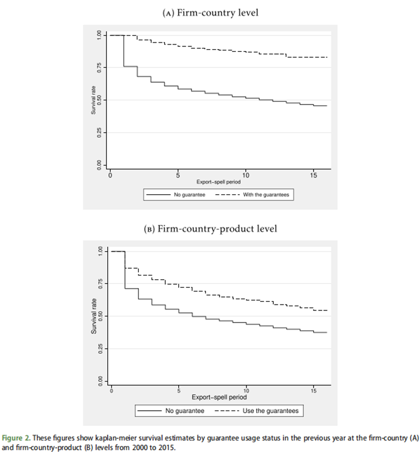 图1表明,有担保的出口流具有更高的生存率。为了进一步探究这一点,图2展示了Kaplan-Meier非参数估计的结果。研究表明初在有担保的情况下,企业-国家层面的生存率在整个研究期内都保持在75%以上。