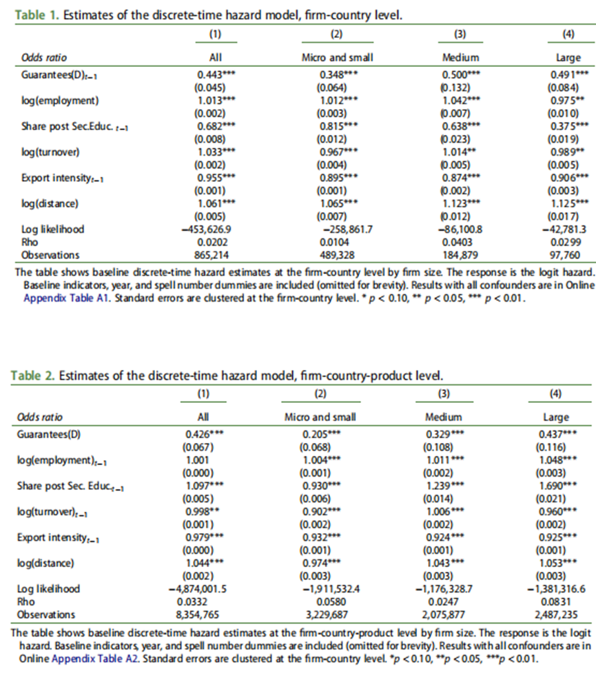 表1展示了离散时间风险模型在国家层面的估计结果,而表2展示了在国家-产品层面的估计结果。结果表明,信贷担保显著降低了风险比率,平均使退出概率降低了50-65%。这种关联在微型和小型企业中最为强烈,尤其是在产品-国家层面。