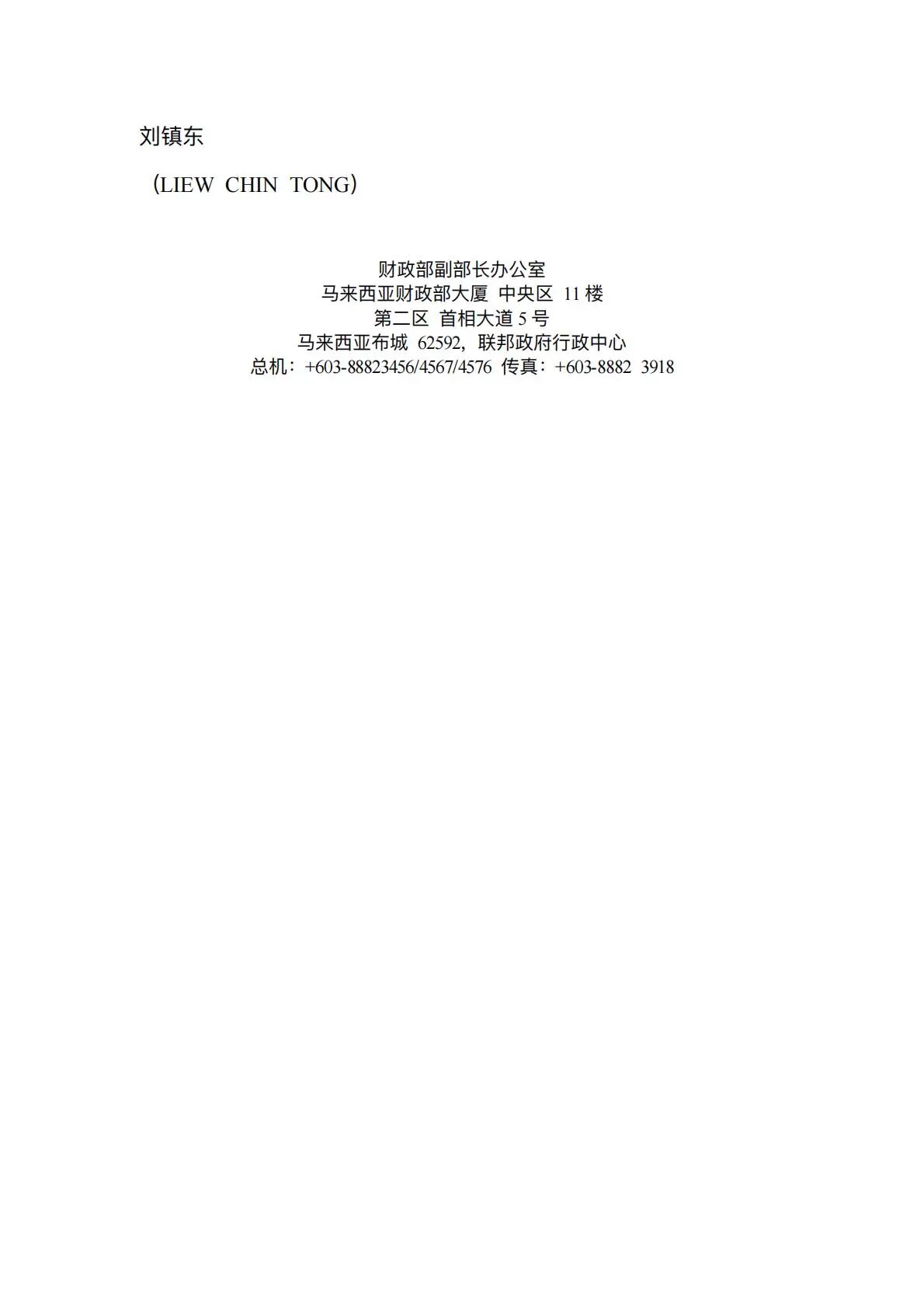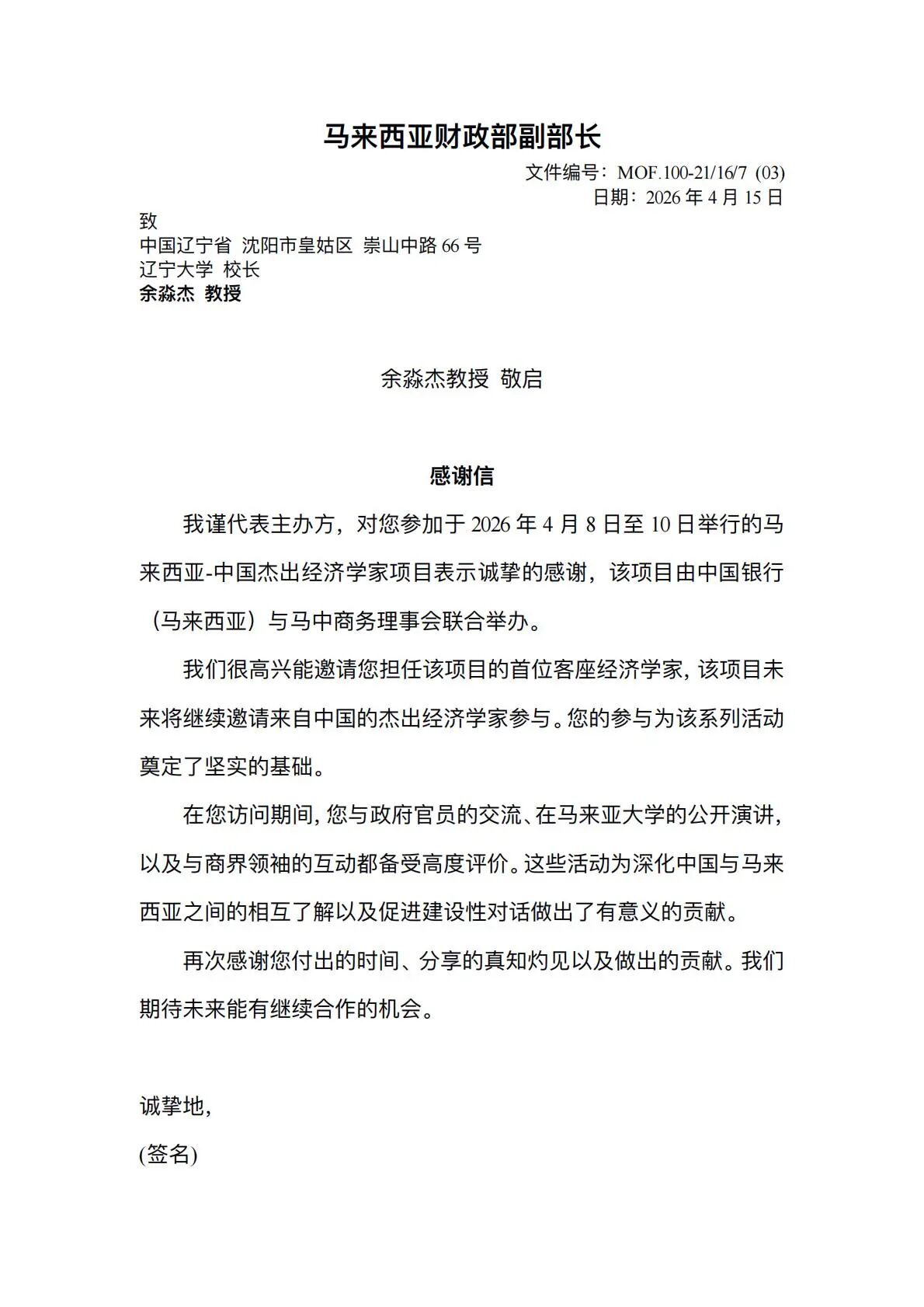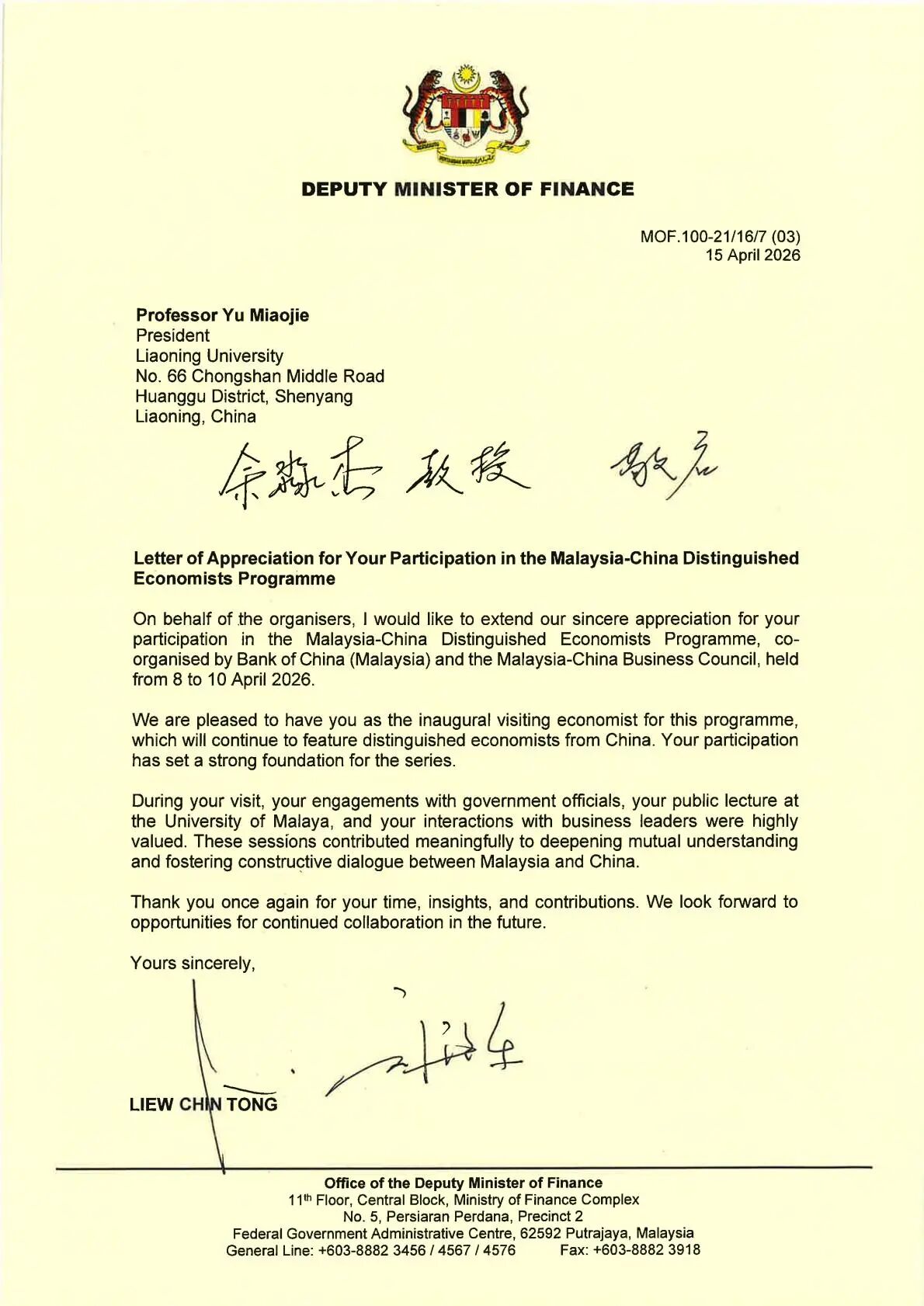 马来西亚财政部及其副部长刘镇东专门致信,对余淼杰教授参加马来西亚-中国杰出经济学家项目表示诚挚感谢。