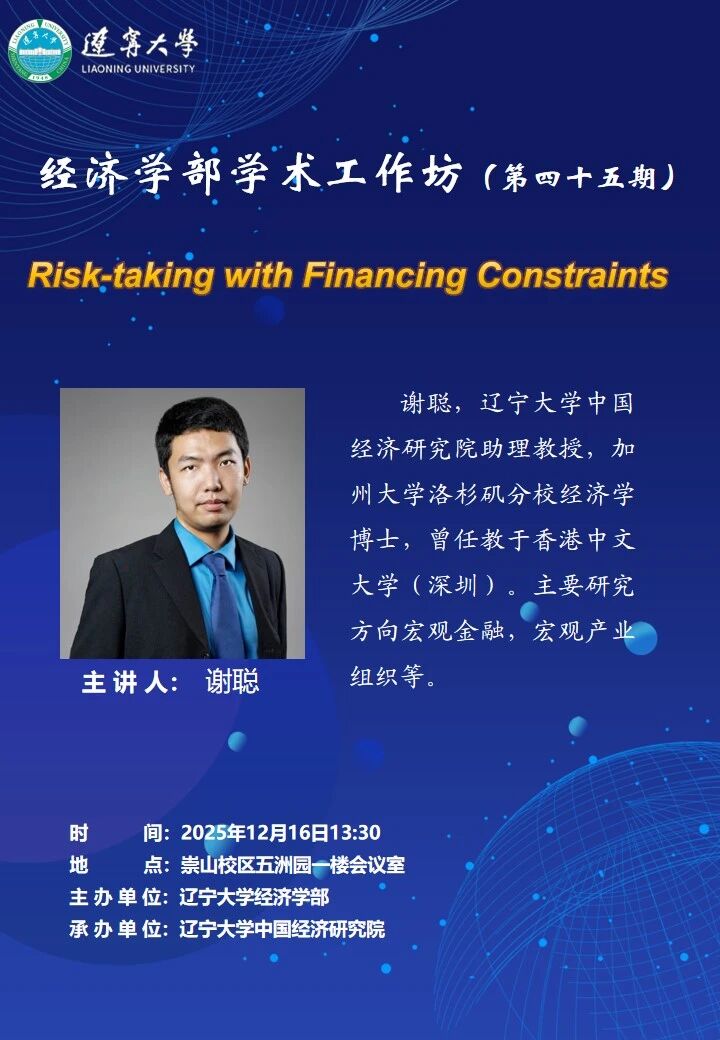 为加快推进经济学科建设,激发中青年教师思想碰撞,强化学术研究互促互进,以高水平科研成果为学校“双一流”建设助力,经济学部持续开展“学术工作坊”。本期学术工作坊邀请中国经济研究院谢聪助理教授作为主讲嘉宾,带来题为“Risk-taking with Financing Constraints”的学术报告。